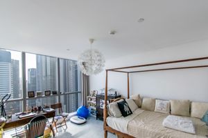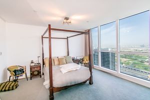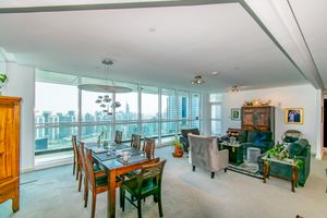 Making your way through the property, you are met by three impressive bedrooms, complete with built-in wardrobes, and all of them en-suite. The master bedroom is a truly special offering, with a south-facing wall of floor-to-ceiling windows and direct access to the balcony. The beautiful en-suite boasts dual sinks and statement backlit mirrors alongside a stand-alone bath and shower.