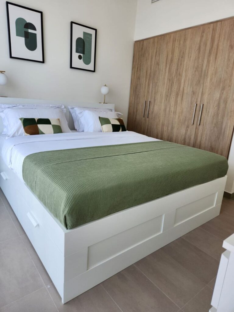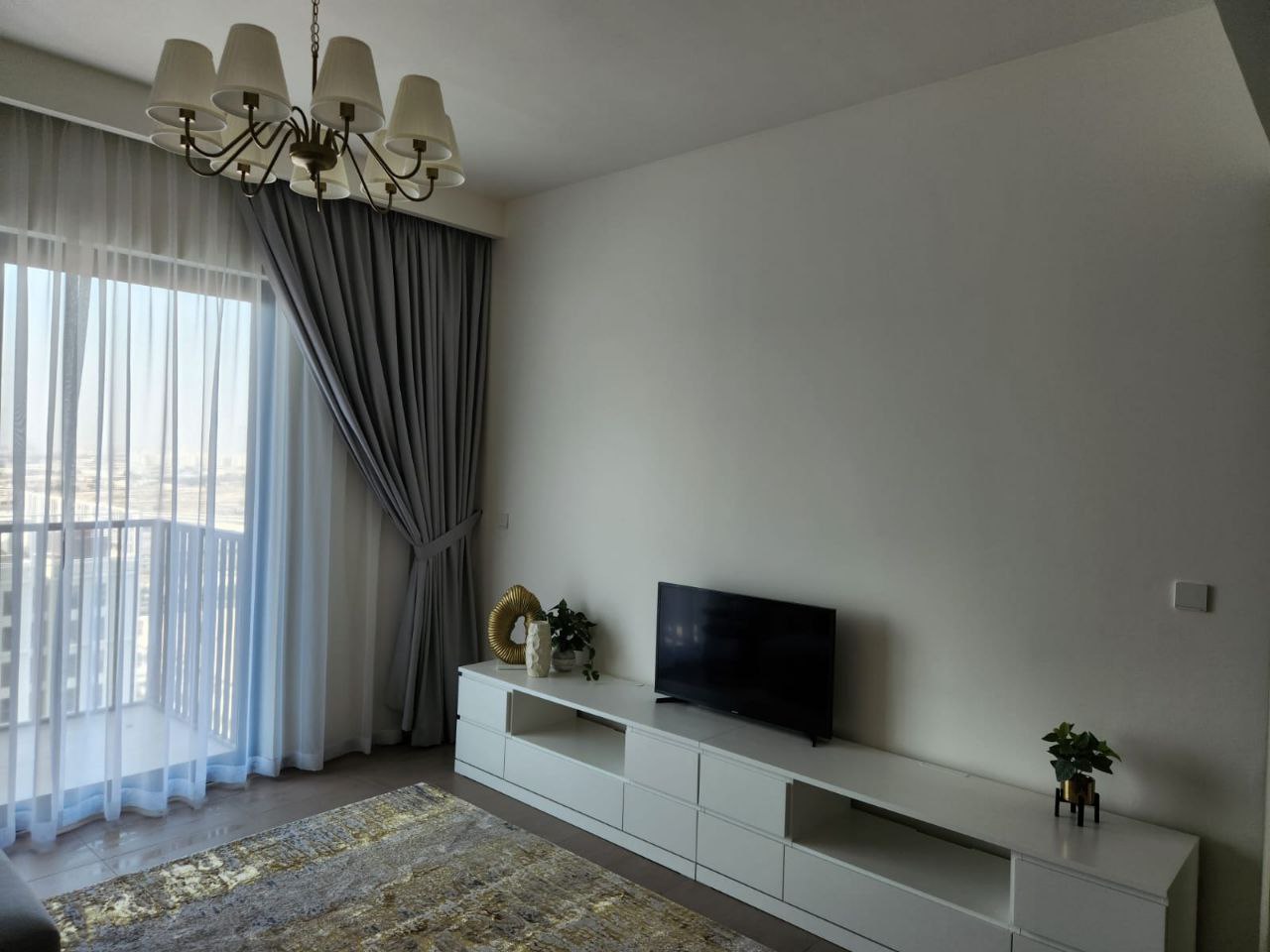Fully equipped with high-quality appliances and modern furnishings, including a 50-inch TV, the apartment is designed for both comfort and style. The well-proportioned bedroom offers large windows, built-in wardrobes, and coordinated bedside tables, creating a serene and functional retreat.