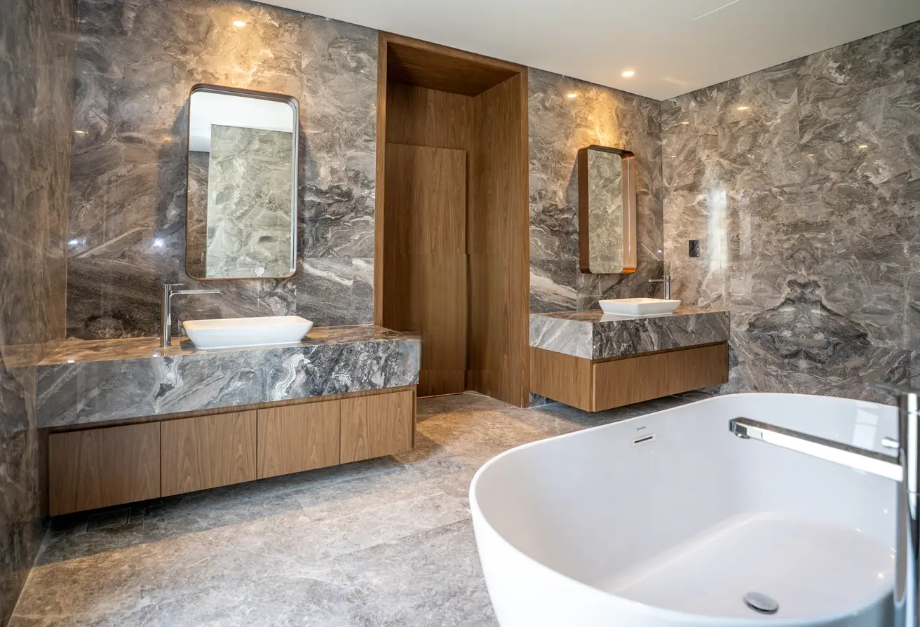 The accommodation comprises open living/dining room/2 kitchens, outside terraces, 6 bedrooms, powder room, gym, yoga room and much more. The kitchen is fitted with a range of floor and wall mounted units, gas hob and oven and white goods which are included in the sale. Bedrooms are well-proportioned with large fitted wardrobes offering plenty of useful storage space. The bathroom / shower rooms are fitted with a two-piece suite and an electric walk-in shower. The property benefits from marble flooring throughout, perfect for people who are willing to clean fast. Good size back gardens and parking for at least 4 cars.